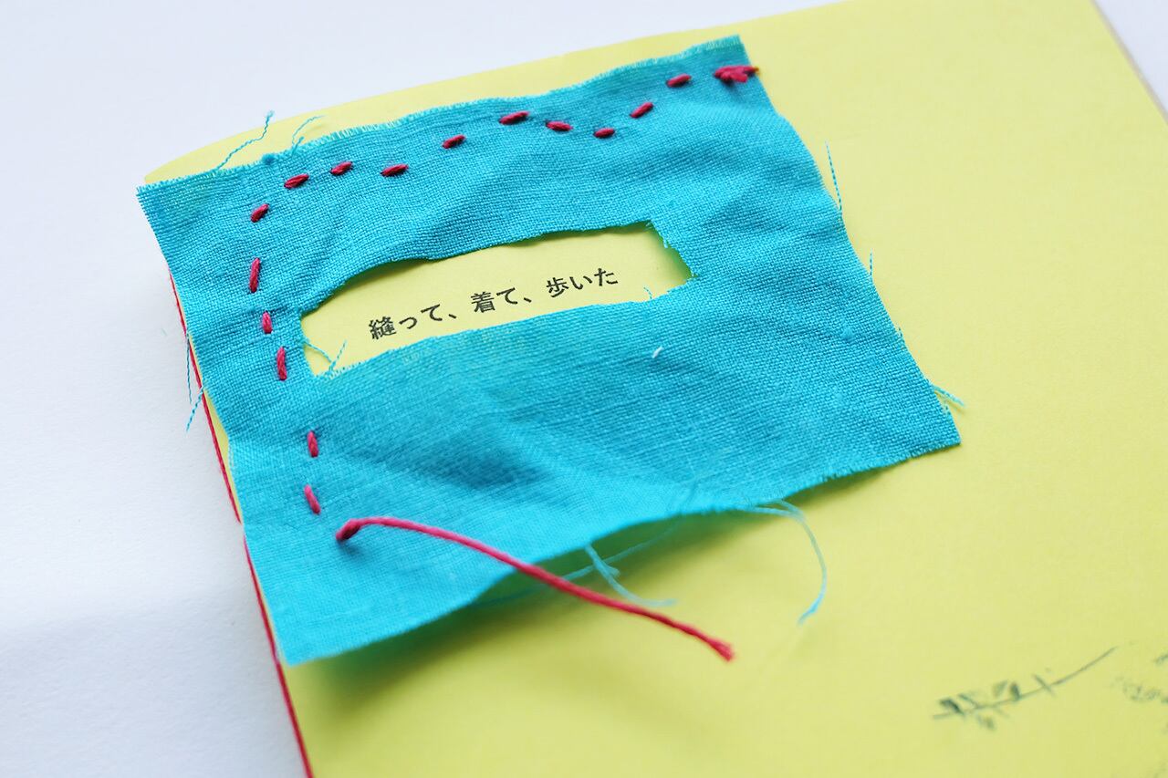 手製本、異なる色の紙、端切れを縫い留めたステッチなど、手作り感満載な一冊です。